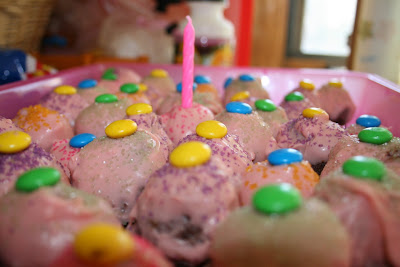 on here: http://bakerella.blogspot.com/2008/05/cupcake-bites-made-easy.html and I just knew that I needed to try to make these. I showed the recipe to my girls and they asked if we could make them for their Gramma's birthday so that is exactly what we did.